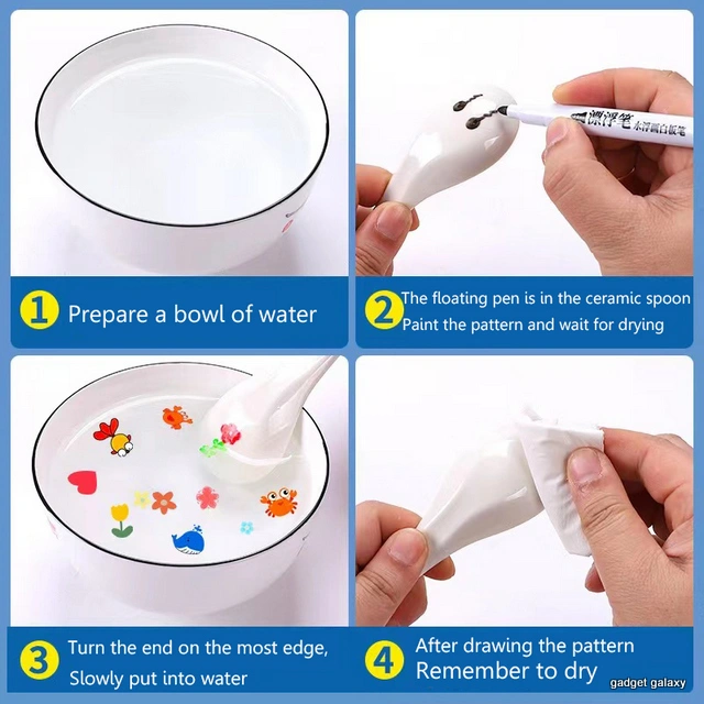 לאחר מכן, טובלים את כף הקרמיקה במים לאט. תראו את הקסם! הדוגמה תרד מכפית הקרמיקה ותצוף על המים!